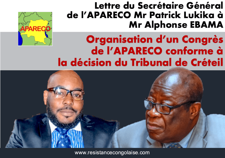 - Lettre du Secrétaire Général de l’APARECO Mr Patrick Lukika à Mr Alphonse EBAMA – Organisation d’un Congrès de l’APARECO conforme à la décision du Tribunal de Créteil