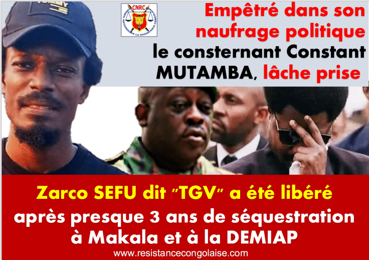 - Empêtré dans son naufrage politique, Constant MUTAMBA lâche prise : Après 3 ans de séquestration à Makala et à la DEMIAP le prisonnier d’opinion Zarco SEFU dit « TGV » a été libéré