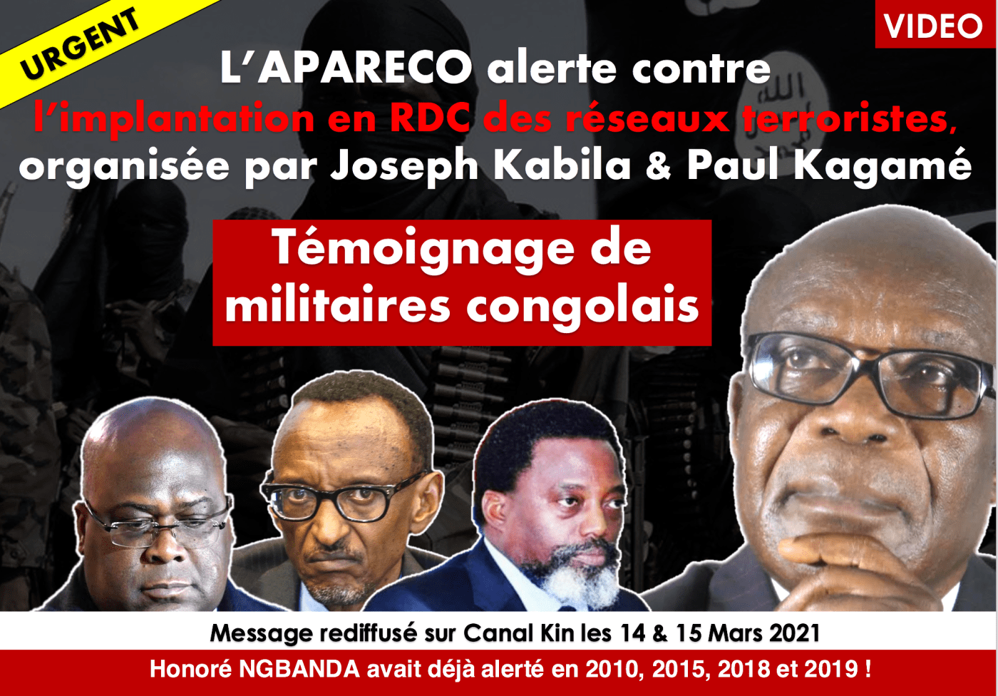 Honoré NGBANDA avait déjà alerté les congolais et la Communauté internationale en 2010, 2015, 2018 et 2019 etc …! Voici l’un de ses messages (Il a été rediffusé sur Canal Kin TV les 14 & 15 Mars 2021) : “L’APARECO alerte contre l’implantation en RDC des réseaux terroristes, organisée par Joseph Kabila et Paul Kagamé” (Oct. 2018)