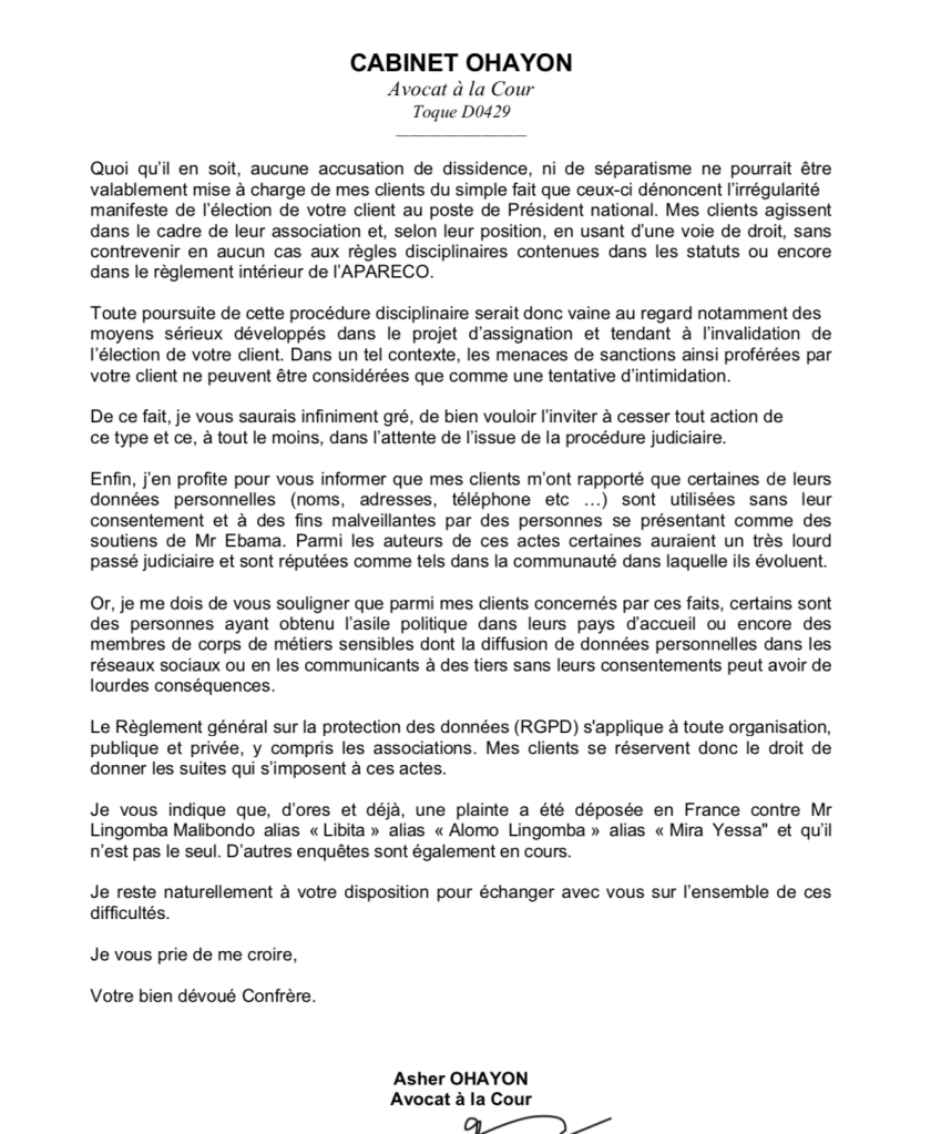 La lettre ci-dessous de Maitre Asher Ohayon adressée à sa consoeur Mme Raphaëlle Aucher , avocate de Mr Ebama et portant sur les dernières manœuvres de ce dernier, en dit long sur ce qui se passe actuellement au sein de l’APARECO : Tous les membres qui contestent son « congrès » illicite entaché d’irrégularités et au cours duquel même pas 100 personnes ont tenté de faire passer Mr Ebama pour le nouveau PN de l’APARECO sont maintenant stigmatisés. Cette campagne ne changera pourtant rien au fait que Mr Ebama est assigné en justice par des dizaines de membres de l’APARECO et que l’audience a été fixée pour le 23 Novembre 2021.