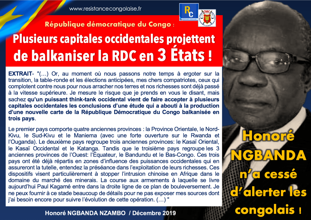 Or, au moment où nous passons notre temps à ergoter sur la transition, la table-ronde et les élections anticipées, mes chers compatriotes, ceux qui complotent contre nous pour nous arracher nos terres et nos richesses sont déjà passé à la vitesse supérieure. Je mesure le risque que je prends en vous le disant, mais sachez qu’un puissant think-tank occidental vient de faire accepter à plusieurs capitales occidentales les conclusions d’une étude qui a abouti à la production d’une nouvelle carte de la République Démocratique du Congo balkanisée en trois pays. Le premier pays comporte quatre anciennes provinces : la Province Orientale, le Nord-Kivu, le Sud-Kivu et le Maniema (avec une forte ouverture sur le Rwanda et l’Ouganda). Le deuxième pays regroupe trois anciennes provinces: le Kasaï Oriental, le Kasaï Occidental et le Katanga. Tandis que le troisième pays regroupe les 3 anciennes provinces de l’Ouest: l’Equateur, le Bandundu et le Bas-Congo. Ces trois pays ont été déjà répartis en zones d’influence des puissances occidentales qui en assureront la tutelle, entendez la préséance dans l’exploitation de leurs richesses. Ces dispositifs visent particulièrement à stopper l’intrusion chinoise en Afrique dans le domaine du marché des minerais. La course aux armements à laquelle se livre aujourd’hui Paul Kagamé entre dans la droite ligne de ce plan de bouleversement. Je ne peux fournir à ce stade beaucoup de détails pour ne pas exposer mes sources dont j’ai besoin encore pour suivre l’évolution de cette opération.