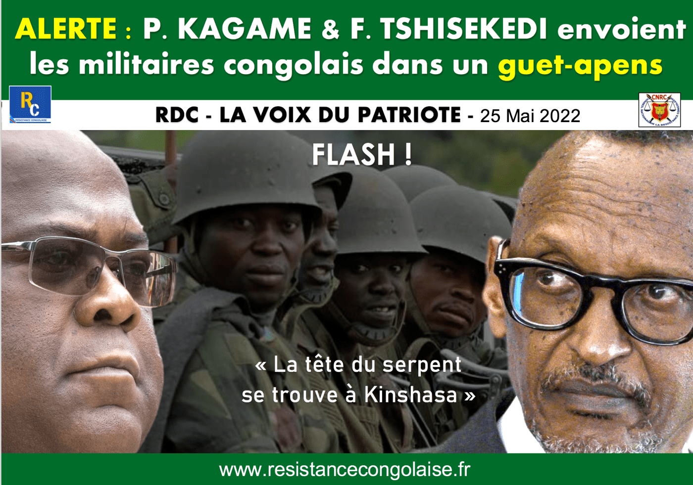 Notre rédaction a été informée dans la matinée, que ce mercredi 25 mai 2022 aux alentours de 8H du matin, Félix Tshisekedi a envoyé en « renfort » à l’est de la RDC, plus de 3000 hommes avec des armes et d’autres matériels militaires pour rejoindre le front des combats qui s’intensifient à l’Est de la RDC . Malheureusement pour les militaires de la FARDC , les militaires rwandais infiltrés dans leurs rangs ont déjà communiqué à Kigali tout le détail concernant le nombre effectif de nos militaires et tout le matériel dont ils vont disposer. Les rwandais se préparent donc déjà en conséquence.