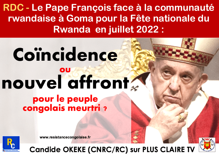 Lors de notre récente intervention sur Plus Claire TV https://youtu.be/ktiieyYotro , nous avions alerté les congolais sur la portée hautement politique du voyage du Pape François à l’Est de la RDC et nous avions attiré leur attention sur l’ambiguïté du choix de la date de sa visite à Goma, le jour de la fête nationale …du Rwanda . Il est en effet à noter qu’ une importante communauté rwandaise vit dans cette ville depuis l’agression dont la République démocratique du Congo fait l’objet de la part du Rwanda. Et dans le contexte actuel , nos sources nous informent que cette communauté se mobilise déjà en masse pour accueillir le Pape Francois au nez et à la barbe des congolais .