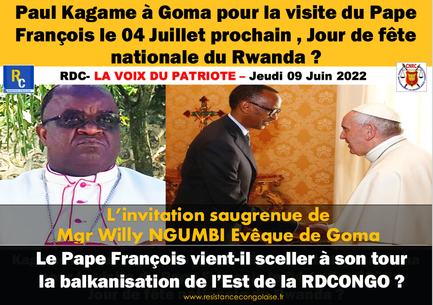 «Je serai très heureux de voir Paul Kagame à Goma pour suivre le message du pape François car son message est sur la fraternité, la réconciliation et la paix. Si Kagame vient à cette visite, nous serons heureux de l’accueillir » MGR Willy NGUMBI Evêque de Goma /07 JUIN 2022