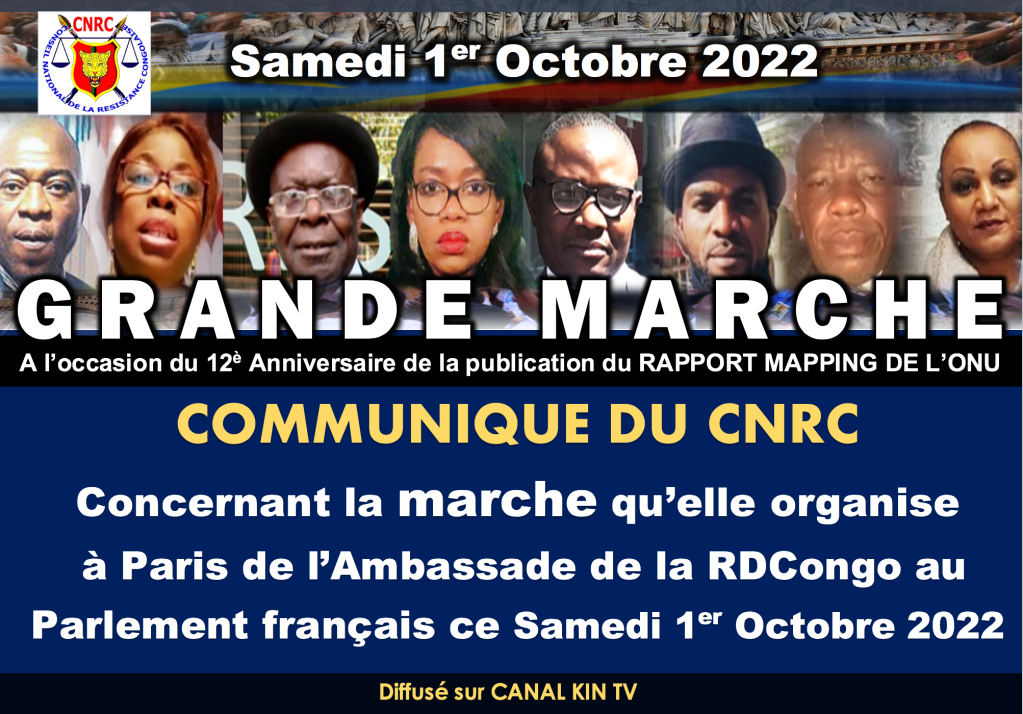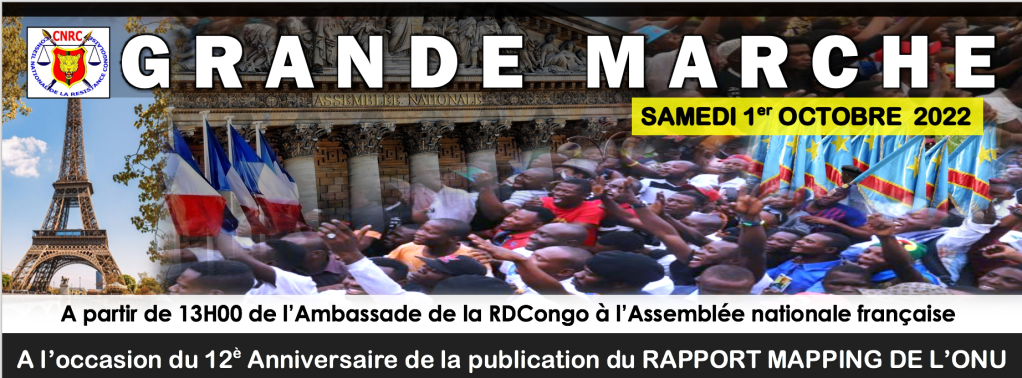 A l’occasion du 12è anniversaire de la publication du Rapport Mapping de l’ONU et contre l’occupation & le processus de balkanisation en cours en RDC : Le CNRC organise une Grande Marche à Paris, le Samedi 1er Octobre 2022 à partir de 13H00 de l’Ambassade de la RDCongo au Parlement français