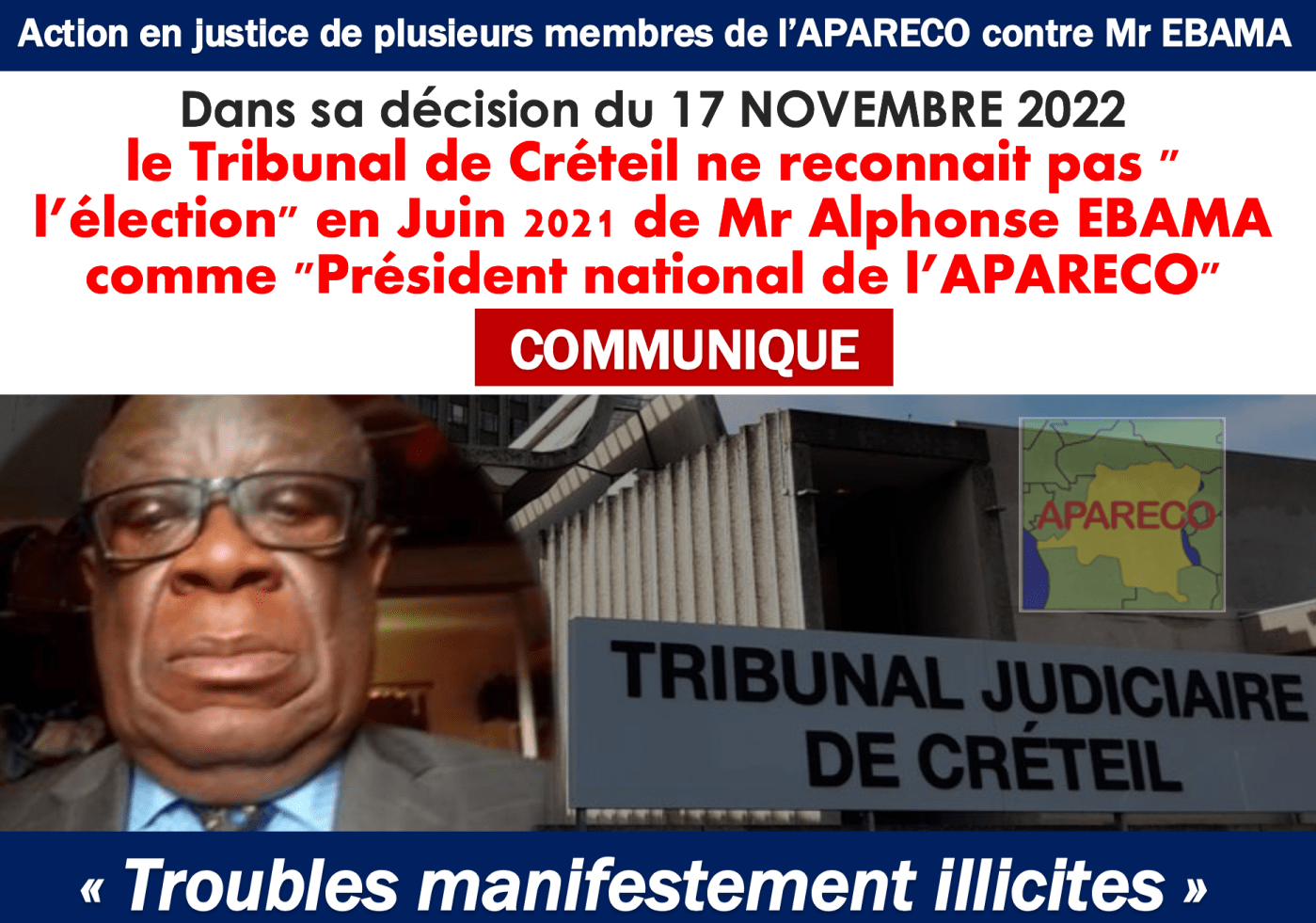 - Le Tribunal de Créteil ne reconnait pas à Mr Ebama la qualité de « Président national de l’APARECO » comme il s’en prévalait depuis Juin 2021.
