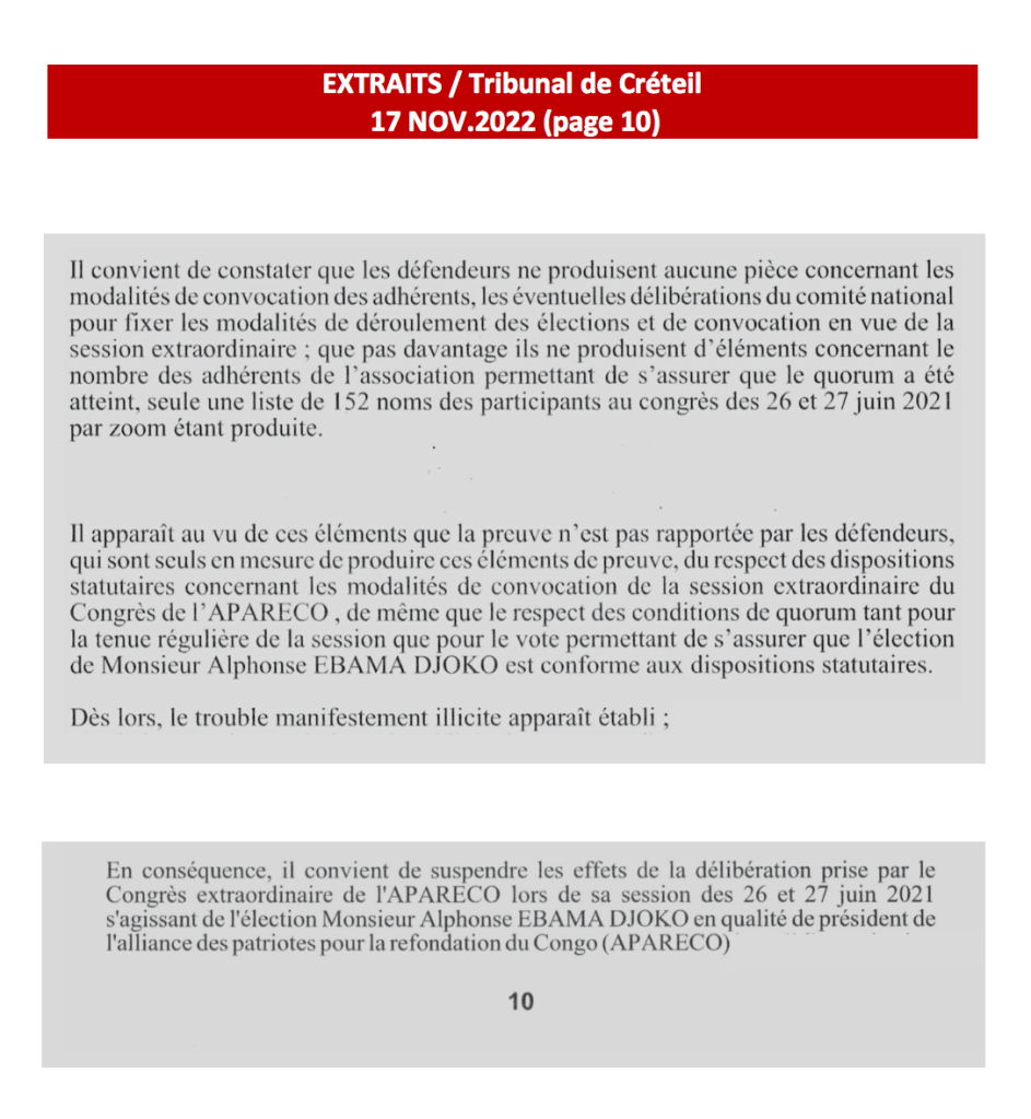 - Résultat de l’action en justice d’une soixantaine de membres de l’APARECO contre Mr Ebama suite au « Congrès » organisé par ce dernier : Le Tribunal de Créteil leur donne raison en confirmant l’irrégularité de ce « Congrès » dont il suspend tous les effets , et ne reconnait pas l’élection de Mr Ebama comme Président National de l’APARECO
