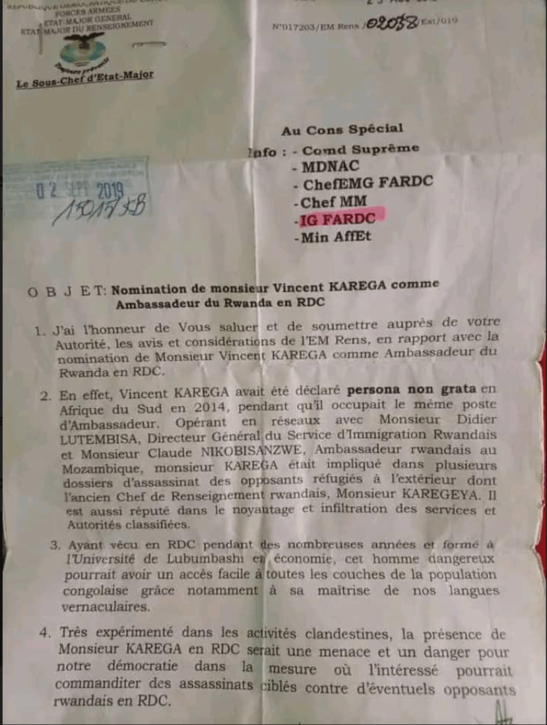 Et maintenant que ses troupes opérationnelles ont investi le terrain, grâce à la complicité de Félix Tshisekedi, Kagamé vient d’envoyer le maître d’ouvrage, son tueur à gage le plus réputé dans le monde, comme nouvel ambassadeur du Rwanda en RDC ! Il s’agit de Vincent KAREGA que l’Afrique du Sud ne veut plus comme ambassadeur chez elle, parce qu’il est impliqué dans l’assassinat de plusieurs opposants rwandais réfugiés dans le pays de Mandela.
