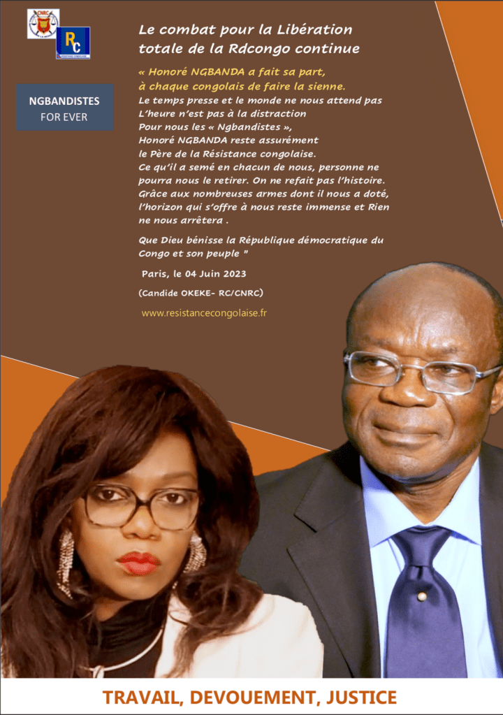 Le temps presse et le monde ne nous attend pas. L’heure n’est pas à la distraction. Pour nous les « Ngbandistes », Honoré NGBANDA reste assurément le Père de la Résistance congolaise. Ce qu’il a semé en chacun de nous, personne ne pourra nous le retirer. On ne refait pas l’histoire. Grâce aux nombreuses armes dont il nous a doté, l’horizon qui s’offre à nous reste immense et Rien ne nous arrêtera .