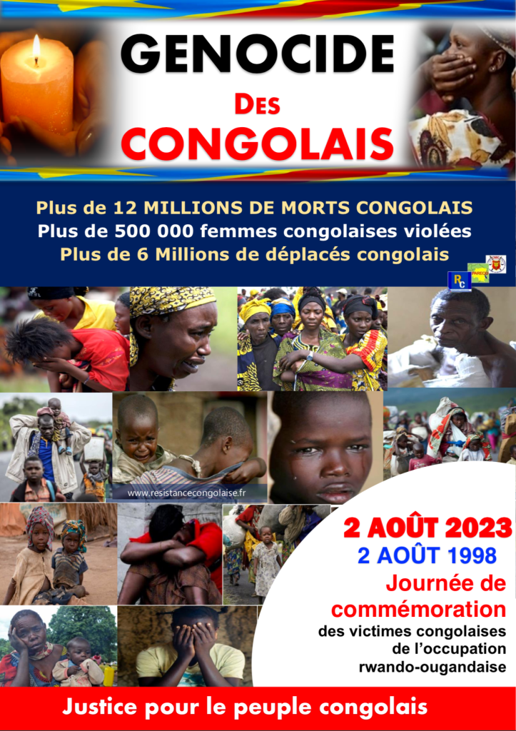 Paris, le 02 Août 2023- Le Conseil National de la Résistance Congolaise (CNRC en sigle) salue la mobilisation des congolais en ce 02 Aout 2023 comme journée en hommage aux victimes congolaise du génocide en cours en RDC suite à l’occupation rwando ougandaise. Le CNRC félicite tous ceux de nos compatriotes qui ont évité d’en faire une journée des festivités folkloriques veillant ainsi à préserver dignement une page cruciale de notre histoire en tant que nation.
