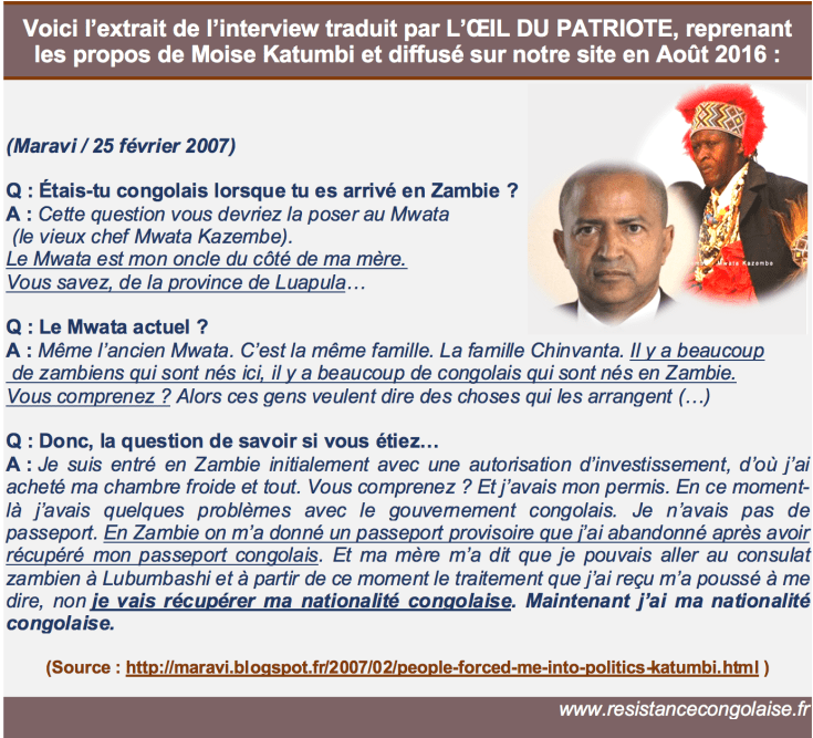 - Sous le titre « Dans une interview accordée en 2007, Moise Katumbi avoue lui-même ses origines zambiennes ! » http://www.info-apareco.com/2017/05/06/moise-katumbi-confirme-ses-origines-zambiennes/, l’APARECO a relayé d’abord un article paru sur un site zambien « Maravi » en Mars 2007 http://maravi.blogspot.fr/2007/03/katumbi-is-my-nephew-like-it-or-not.html.Il y est repris textuellement les propos du chef coutumier zambien Mwata Kazembe qui affirme que Moise Katumbi est son neveu.