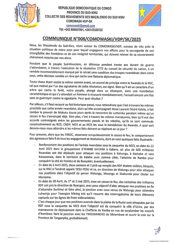 COMMUNIQUE DU COLLECTIF DES MOUVEMENTS DES WAZALENDOS DU SUD KIVU