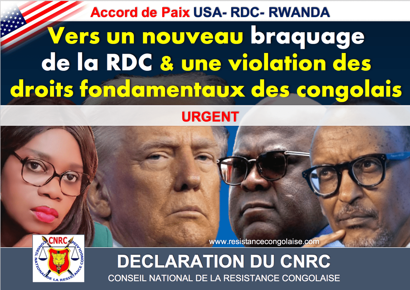 Malgré les tentatives du CNRC de faire entendre raison aux différents acteurs impliqués dans ce projet, l’annonce faite le 18 Juin 2025, d’une signature prochaine du prétendu « accord de paix » , confirme que les États-Unis d’Amérique ainsi que les régimes en place en RDC et au Rwanda sont déterminés à spolier et à nier les droits fondamentaux du peuple congolais tout en continuant à piétiner le droit international .
