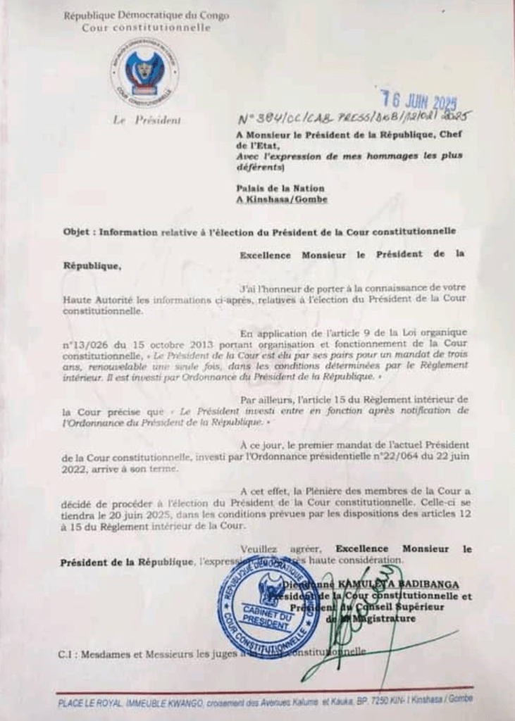 Au vu des textes régissant cette institution, Monsieur Kamuleta n’était déjà pas éligible comme président de la cour pour 3 ans, parce que son mandat comme juge expire dans moins de 3 ans, soit en avril 2027. Comment peut-il postuler pour un mandat de président de la cour vu que celui-ci devra prendre fin en …2028 ?