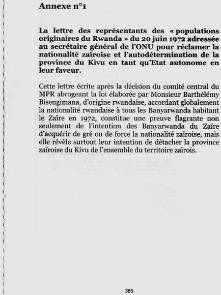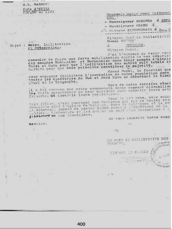 La création d’une chefferie pour les Banyarwanda n’est intervenue qu’après l’importation de la main d’œuvre abondante que les missionnaires de Rutshuru amenaient avec eux du Rwanda voisin. Cette réalité historique a été reconnue et admise par Monseigneur Faustin Ngabu, alors président de l’Episcopat du Congo et évêque du diocèse de Goma, dans sa lettre pastorale pascale du 11 avril 1998. Dans cette lettre, il disait que : «Chez nous, les principales tribus ou communautés socio-politiques s’appellent, je cite par ordre alphabétique :Bahavu, Bahunde, Banande, Banyanga, Barega, Bashi, Batembo. Les Banyarwanda (Hutus et Tutsis), du moins ceux qui l’ont été, ceux qui ne veulent plus de ce titre et ceux qui se reconnaissent encore sous ce vocable, voudront bien comprendre que, dans leur cas, la notion de « tribu » qu’ils se donnent lorsqu’ils se déclarent Hutu et Tutsi ne peut aps être comprise dans le même sens que celle des autres communautés citées ci-haut. En effet, contrairement à celle des Hutus et Tutsis, les communautés Havu, Hunde, Nande, Nyanga et tembo ont chacune leur « Mwami » et leur « Balu » ou « Vakama », qui sont respectivement leurs chefs d’Etats et cadres dirigeants dans le contexte précolonial. Ces communautés ont leurs valeurs traditionnelles qui sont fondées sur leurs langues, leurs territoires, leurs coutumes et leurs propres organisations familiales, matrimoniales, culturelles, économiques, politiques et religieuses. Pour le cas des Hutus et des Tutsis, après 23 ans déjà passés dans ce diocèse, je ne suis pas capable d’en dire autant ; comment chacun de ces deux groupes Hutu et Tutsi constitue-t-il une tribu ? A eux de le comprendre et d’en convaincre les autres.»[5]