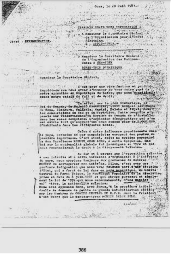 Pour promouvoir l’acquisition frauduleuse de la nationalité congolaise, les Tutsis rwandais établi de manière massive et systématique dans le Kivu, ont forgé des ethnonymes et des gentilés jusque-là inconnus de la nomenclature des tribus autochtones répertoriées en RDC après l’accord germano-belge de 1910, qui fixait définitivement notre frontière orientale pendant toute la période coloniale.