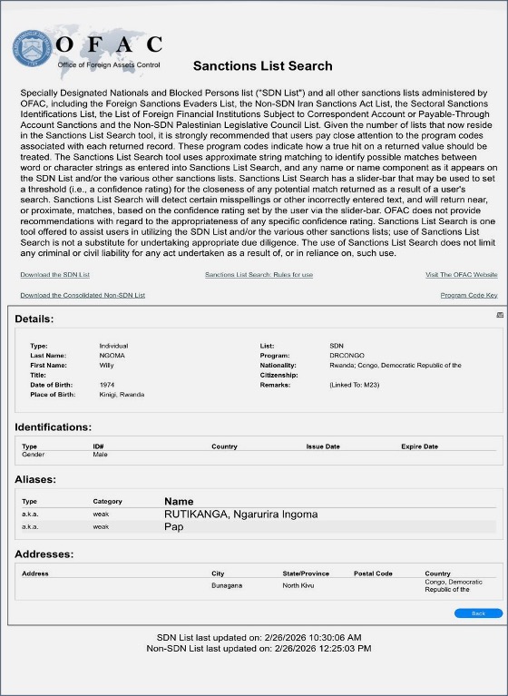 2. Aujourd’hui, on apprend qu’à la suite des informations annonçant sa mort lors d’une récente frappe de drone des FARDC, des documents officiels du Trésor américain indiquaient que le porte-parole du M23, Willy Ngoma, était inscrit sur la liste de sanctions de l’OFAC comme étant de nationalité rwandaise, avec pour lieu de naissance Kinigi, au Rwanda. Son véritable nom rwandais est, toujours d’après l’OFAC » RUTIKANGA, Ngarurira Ingoma «