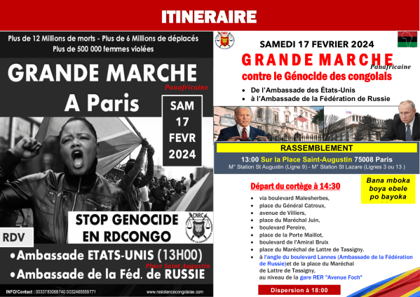 PARIS/Grande Marche contre le Génocide en RDC-ITINERAIRE : Rassemblement Place Saint Augustin à 13H00 – Ambassade des USA-Ambassade de la Fédération de Russie / Sam 17 Fév 2024