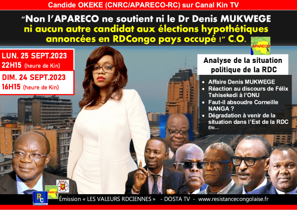 Candide OKEKE (CNRC/APARECO-RC) sur Canal Kin TV Analyse de l'actualité politique de la RDC- LUNDI . 25 SEPT.2023 22H15 (heure de Kin)- DIMANCHE 24 SEPT. 2023 16H15 (Heure de Kin) "Non l’APARECO ne soutient ni le Dr Denis MUKWEGE ni aucun autre candidat aux élections hypothétiques annoncées en RDCongo pays occupé !" C.O. •Affaire Denis... Lire la Suite →