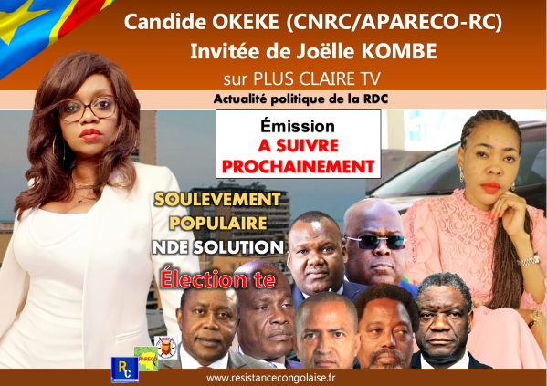 Candide OKEKE (CNRC/APARECO-RC) Invitée de Joëlle KOMBE sur PLUS CLAIRE TV Actualité politique de la RDC A SUIVRE PROCHAINEMENT RDC/ "Soulèvement populaire nde solution élection te!"