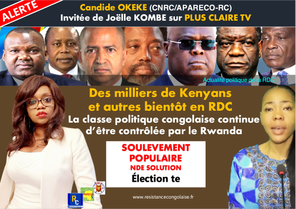 RDC/ VIDEO-Des milliers de Kenyans bientôt en RDC - La classe politique congolaise otage du Rwanda- Candide OKEKE(CNRC/APARECO-RC) sur Plus Claire TV https://youtu.be/OVcJ2M2_GT0?si=WRJqIvKpyQ5mE-9X