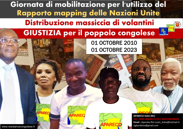 Rapport Mapping 13è Anniversaire / L'APARECO Italie (RC) sensibilise à Rome - Justice pour le peuple congolais (1er Oct 2023) Giornata di mobilitazione per l'utilizzo del Rapporto mapping delle Nazioni Unite sui crimini guerra e di genocidio nella Repubblica democratica del Congo e per porre fine all'impunità nella regione dei Grandi Laghi in Africa Distribuzione... Lire la Suite →