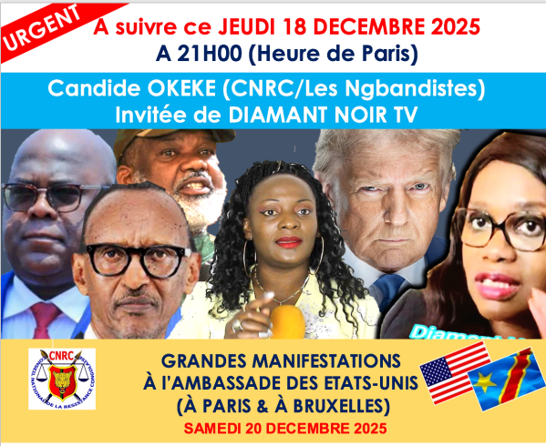 A suivre ce JEUDI 18 DECEMBRE 2025 à 21 H00 (Heure de Paris) Candide OKEKE (CNRC/Les Ngbandistes) Invitée de DIAMANT NOIR TV