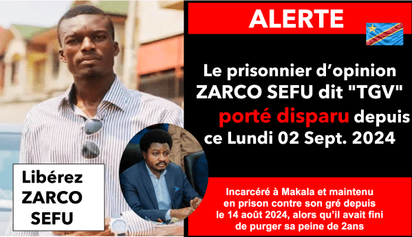 ALERTE : Zarco SEFU dit "TGV" est porté disparu depuis ce Lundi 02 Septembre 2024 ! Kinshasa, le 03 Septembre 2024 - Des proches de Zarco SEFU dit TGV, emprisonné à la prison de Makala pour ses opinions depuis 2 ans, lancent l’alerte . Alors que ce dernier avait fini de purger sa peine et aurait dû... Lire la Suite →