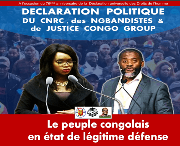 Déclaration politique du CNRC, des NGBANDISTES & de JUSTICE CONGO GROUP à l’occasion du 76ème anniversaire de la Déclaration universelle des Droits de l’homme : Le peuple congolais en état de légitime défense A l’occasion du 76ème anniversaire de la déclaration universelle des droits de l’homme en ce mois de décembre 2024 nous, membres de la... Lire la Suite →