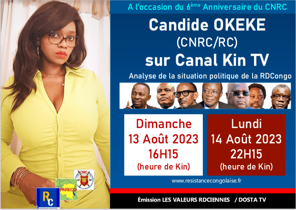 A SUIVRE- Candide OKEKE (CNRC/RC) sur Canal Kin TV (CKTV) Ce Dimanche 13 Août & Lundi 14 Août / Actualité politique de la RDC / 6eme Anniversaire du CNRC