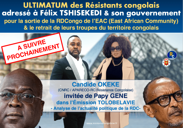 A SUIVRE PROCHAINEMENT Candide OKEKE (CNRC / APARECO-RC Résistance Congolaise) invitée de Papy GENE dans l’Émission TOLOBELAVIE - Analyse de l’actualité politique de la RDC- ULTIMATUM des Résistants congolais adressé à Félix TSHISEKEDI & son gouvernement pour la sortie de la RDCongo de l’EAC (East African Community) & le retrait de leurs troupes du territoire... Lire la Suite →
