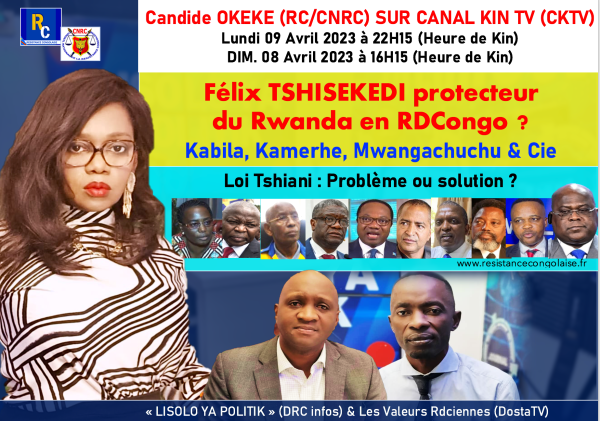 Candide OKEKE (RC/CNRC) SUR CANAL KIN TV (CKTV) Félix TSHISEKEDI protecteur du Rwanda en RDCongo ? Kabila, Kamerhe, Mwangachuchu & Cie Loi TSHIANI: Problème ou Solution ? Lundi 09 Avril 2023 à 22H15 (Heure de Kin) DIM. 08 Avril 2023 à 16H15 (Heure de Kin)