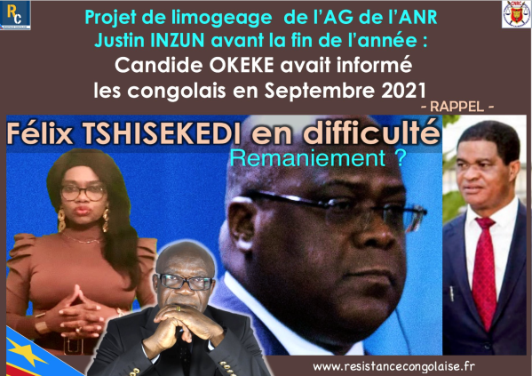 RAPPEL-Limogeage de Justin INZUN AG de L'ANR avant la fin de l'année : Nous vous avions informé depuis Sept 2021 https://youtu.be/jnWztCNI5Ag Article du 20 Septembre 2021 Sacré meilleur élève de Joseph KABILA Félix TSHISEKEDI, envisage des changements dans son entourage https://resistancecongolaise.fr/2021/09/21/rdc-sacre-meilleur-eleve-de-kabila-f-tshisekedi-envisage-des-changements-dans-son-entourage-loeil-du-patriote-partie-i/ Dans une interview accordée à la Radio Vatican en janvier 2020, Félix Tshisekedi, comme son « mentor »... Lire la Suite →