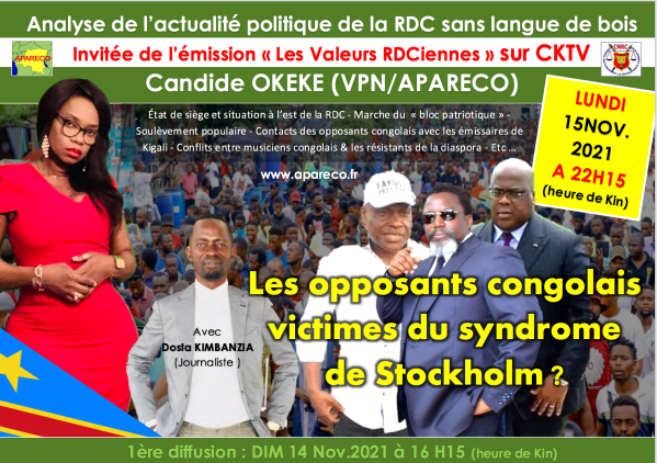 A suivre / Candide OKEKE (VPN/APARECO) sur CKTV Dimanche 14 Nov & Lundi 15 Novembre 2021 : « Les opposants congolais victimes du syndrome de Stockholm? »