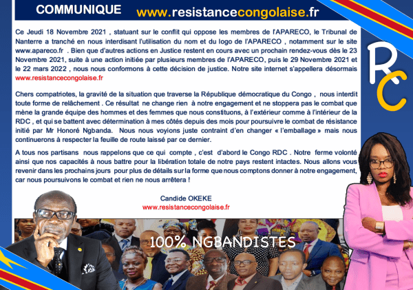 COMMUNIQUE RC: http://www.resistancecongolaise.fr Ce Jeudi 18 Novembre 2021 , statuant sur le conflit qui oppose les membres de l’APARECO, le Tribunal de Nanterre a tranché en nous interdisant l’utilisation du nom et du logo de l’APARECO , notamment sur le site http://www.apareco.fr . Bien que d’autres actions en Justice restent en cours avec un prochain rendez-vous... Lire la Suite →