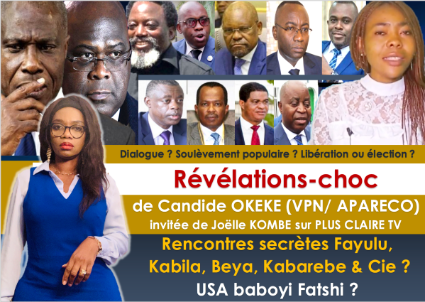 VIDEO/ Révélations-choc de Candide OKEKE (VPN/APARECO) invitée de Joëlle KOMBE sur PLUS CLAIRE TV Rencontres secrètes Fayulu, Kabila, Beya, Kabarebe & Cie ? USA baboyi Fatshi ? Dialogue ? Soulèvement populaire ? Libération ou élection ? https://youtu.be/Mal7hvaKjBI