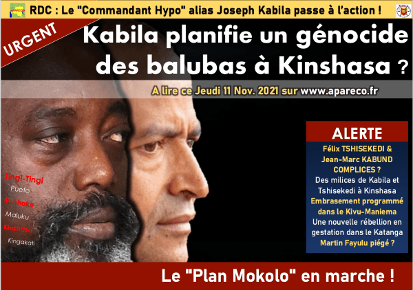 URGENT/ A LIRE ce JEUDI 11 NOV.2021: Kabila planifie un génocide des balubas à Kinshasa ? Tshilombo complice ? Embrasement programmé à l’Est de la RDC-Le plan Mokolo en marche – Fayulu piégé ?