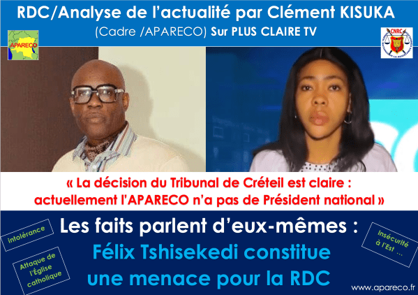 VIDEO/ Clément KISUKA (Cadre APARECO) sur Plus Claire TV : Félix Tshisekedi constitue une menace pour la RDC (Intolérance, attaque de l’église catholique , insécurité à l’Est, …)