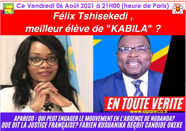 URGENT/ Candide OKEKE (APARECO) invitée de Fabien KUSUANIKA ce Vendredi 06 Août 2021 à 21H00 (Heure) APARECO: Qui peut engager le mouvement en l'absence de Ngbanda? Que dit la Justice Française ? Actualité de la RDC/ Félix Tshisekedi , meilleur élève de "Kabila" ?