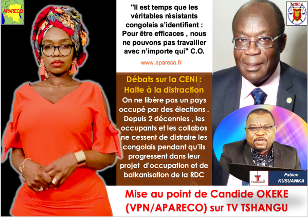VIDEO/ Mise au point de Candide OKEKE (VPN/APARECO) invitée de F.KUSUANIKA sur TV TSHANGU : "Il est temps que les véritables résistants congolais s’identifient : Pour être efficaces , nous ne pouvons pas travailler avec n’importe qui" C.O. Débats sur la CENI : "Halte à la distraction!On ne libère pas un pays occupé par des élections .... Lire la Suite →