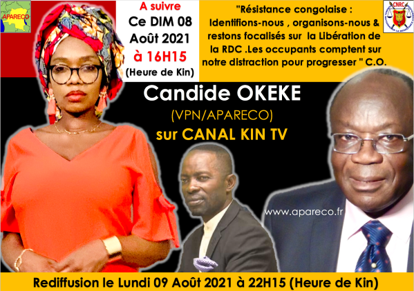A Suivre ce Dimanche 08 Août 2021 à 16H15 (heure de Kin): Candide OKEKE (VPN/APARECO) sur Canal Kin TV (CKTV) Rediffusion Lundi 09 Août 2021 à 22H15 (heure de Kin)