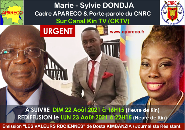 Marie - Sylvie DONDJA Cadre APARECO & Porte-parole du CNRC Sur Canal Kin TV (CKTV) A SUIVRE DIM 22 Août 2021 à 16H15 (Heure de Kin) REDIFFUSION le LUN 23 Août 2021 à 22H15 (Heure de Kin) Émission "LES VALEURS RDCIENNES" de Dosta KIMBANZIA / Journaliste Résistant