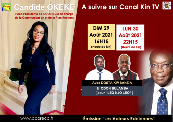 Candide OKEKE (Vice-Présidente /APARECO) sur Canal Kin TV (CKTV) A suivre : Lundi 30 Août 2021 à 22H15 (heure de Kin) Dimanche 29 Août 2021 à 16H15 (heure de Kin ) Avec Dosta KIMBANZIA (CKTV/ DOSTA TV ) & ODON BULAMBA ( LEO NJO LEO)
