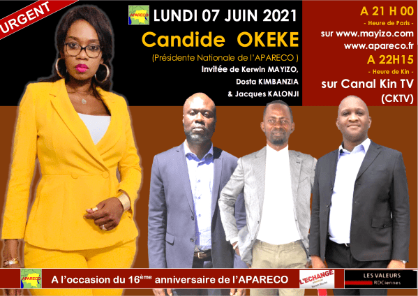 URGENT/ A SUIVRE : Ce LUNDI 07 JUIN 2021 A 21 H00 - Heure de Paris sur http://www.mayizo.com http://www.apareco.fr A 22H15 - Heure de Kin - sur CanalKinTV (CKTV) Candide OKEKE (Présidente Nationale de l’APARECO ) Invitée de Kerwin MAYIZO, Dosta KIMBANZIA & Jacques KALONJI (Emissions "L'ECHANGE" & "Les Valeurs Rdciennes") https://youtu.be/h4Lm2yGN-V4