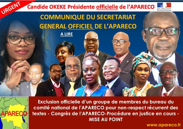 URGENT-COMMUNIQUE et MISE AU POINT du Secrétariat général OFFICIEL de l’APARECO : Exclusion de membres du bureau du comité national de l’APARECO pour non-respect récurrent des textes -Procédure en justice en cours – Congrès de l’APARECO