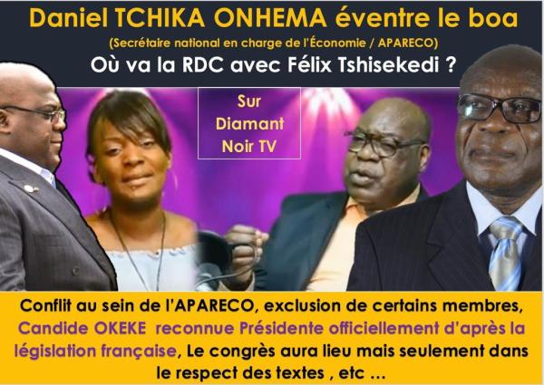 VIDEO/ Daniel TCHIKA ONHEMA éventre le boa sur Diamant noir TV (Secrétaire national en charge de l’Économie / APARECO) Où va la RDC avec Félix Tshisekedi ? A suivre ICI - Conflit au sein de l’APARECO, - exclusion de certains membres, - Candide OKEKE reconnue Présidente officiellement d’après la législation française - Le congrès... Lire la Suite →