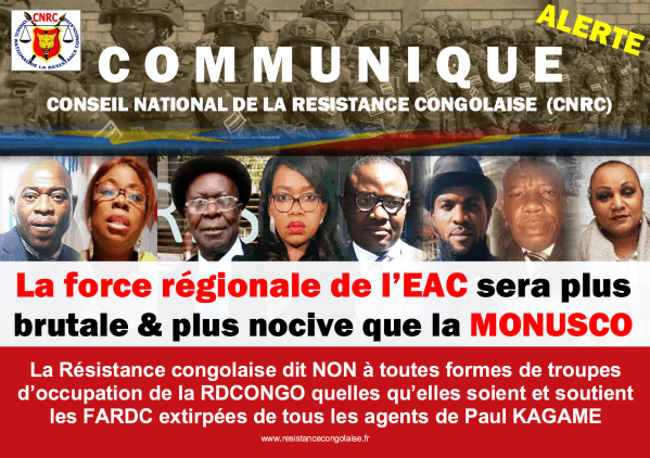 COMMUNIQUE DU CNRC / ALERTE- La force régionale de l’EAC sera plus nocive et plus brutale que la MONUSCO : Non à toutes formes de troupes d’occupation en RDC